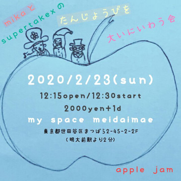 mikaとAppleJamのスーパーベーシストSupeTakeXくんの誕生日をおおいに祝う会だそうです。みんなで祝いましょう♪★日時 02/23(日) Open/12:15 Start/12:30